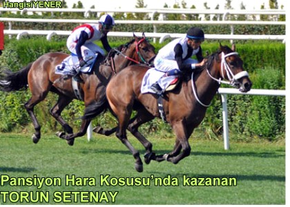 3 yaşlı dişi İngiliz taylarının katılımıyla gerçekleşen Pansiyon Hara Koşusu’nun bu yılki galibi Erhan Kum’un sahibi olduğu, jokey GökhanYıldız ile start alan TORUN SETENAY (Asakir – Miss Ignata / Distant Relative) isimli kısrak oldu. Bursa Osmangazi Hipodromu’nda 2 Ağustos Cuma günü düzenlenen çim pistteki 1700 metre mesafeli koşuyu (Açık – A3 / D) PAN AMORE (Unac-counted For - İlitya / Fantastic Fellow) ikinci olarak tamamlarken ELEVATO (Kaneko - Zeynep Hanım / Distant Relative) ile NESRİN SULTAN (Strike The Gold - Nurçem / Dolphin Street) de tabelanın diğer sıralarını oluşturan safkanlar oldular. Koşuyu kazanan TORUN SETENAY için bitiriş derecesi 1.44.70 olurken farklar 1 Boy – 1 Boy – Boyunşeklinde gerçekleşti. 11 Haziran 2012 tarihinde Bursa Osmangazi Hipodromu’nda katıldığı Şartlı 1 koşuyla yarış hayatına başlayan TORUN SETENAY, kariyerinin 11. startında 5. galibiyetini elde etti. 3 yaşındaki doru dişi tay, son olarak 27 Mart günü İstanbul Veliefendi Hipodromu’nda katıldığı 1500 metre kum (sentetik) pistteki Necdet Çoruh Koşusu’nu (KV-7) bugünkü jokeyi Gökhan Yıldız ile kazanma başarısı göstermişti.